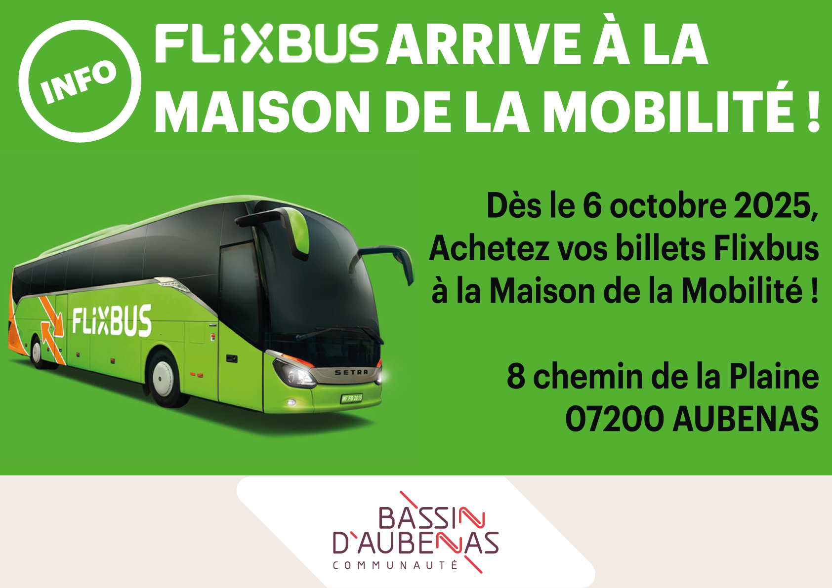 Dès le lundi 6, octobre achetez vos billets Flixbus à la Maison de la Mobilité d’Aubenas !